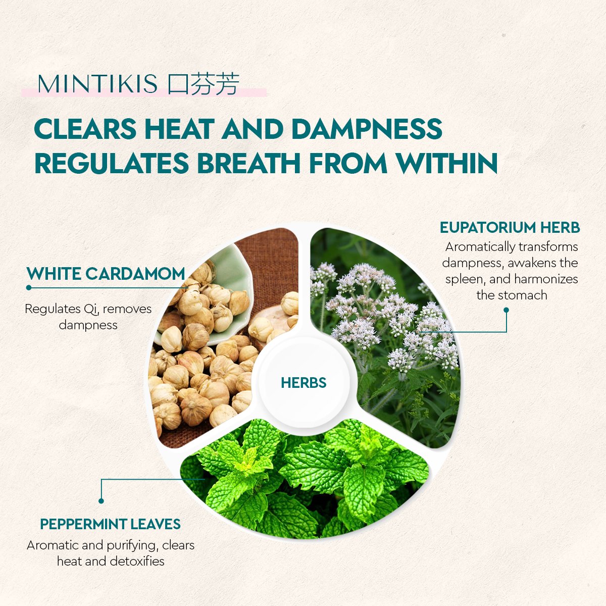 精選 金銀花、蘆根、薄荷葉,有助清熱解毒,舒緩口苦口乾;配合 白朮、佩蘭、茯苓、薏苡仁 等芳香化濕草本,幫助排走體內濕濁,從源頭改善異味問題。