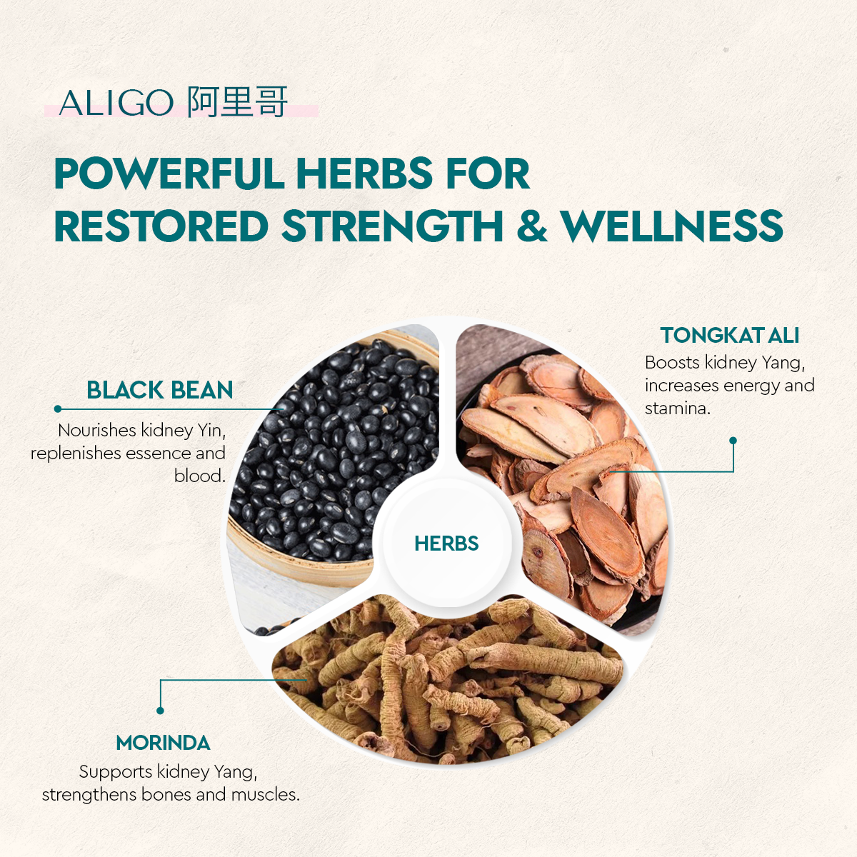 融合東革阿里、巴戟天、黑豆等強效草本成分,無需烹調,即泡即飲,溫和調理,持久見效。支持生殖健康、提升免疫力,係現代人日常補養嘅理想選擇。