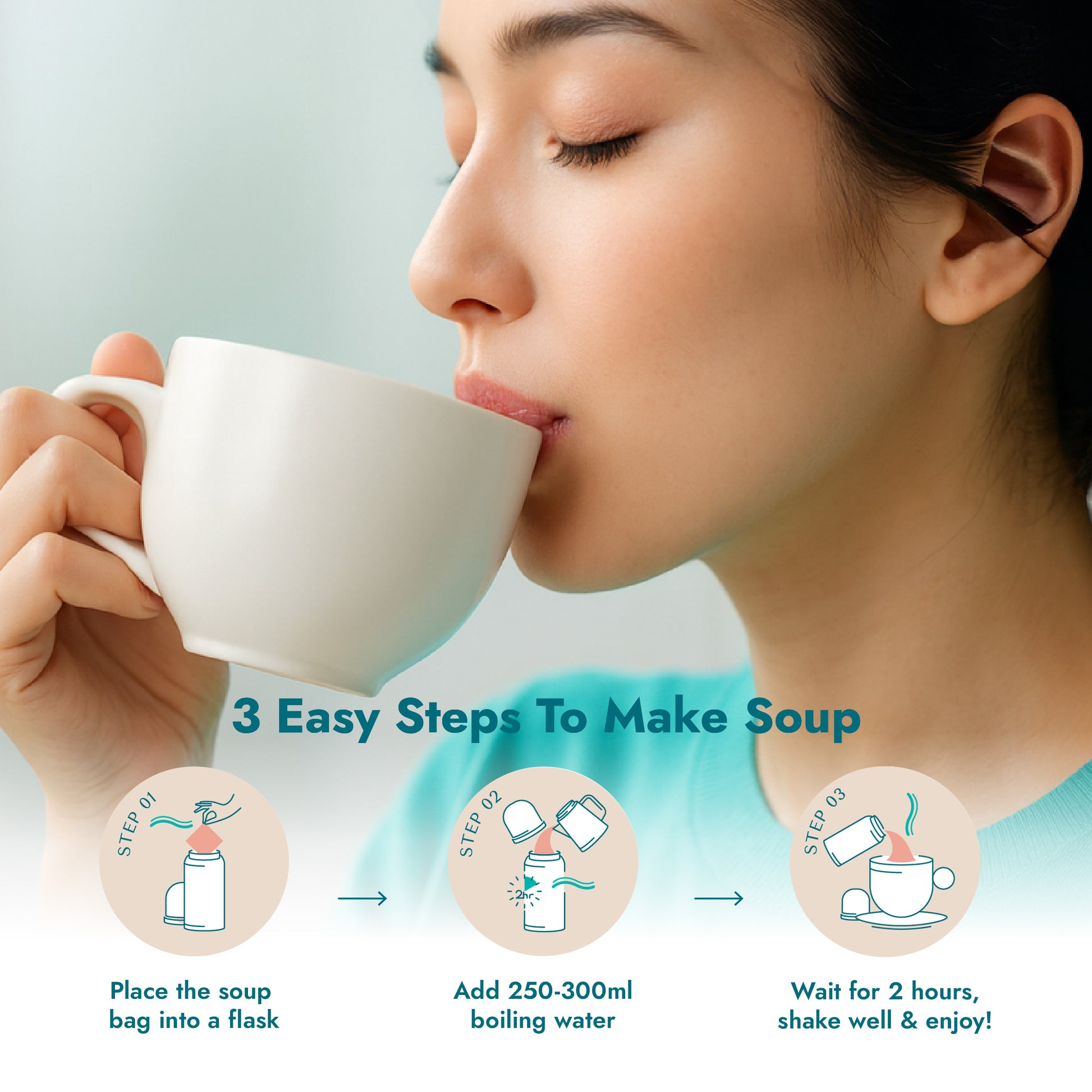 將免煮湯包放入保溫杯,加入250-300毫升的滾水,浸焗2個鐘。搖勻,趁熱飲用。